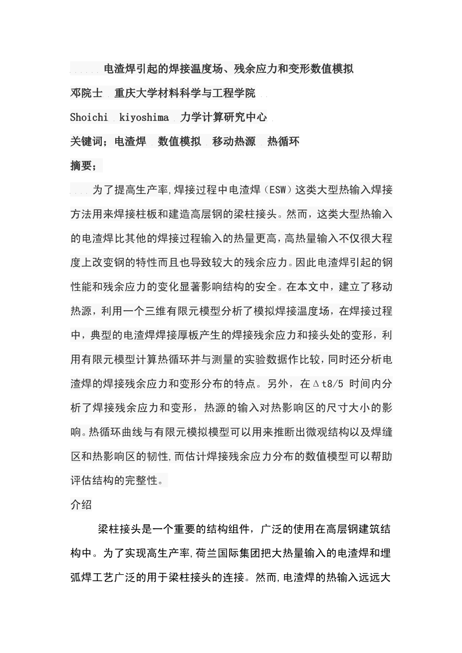 - 电渣焊引起的焊接温度场、残余应力和变形数值模拟外文翻译资料