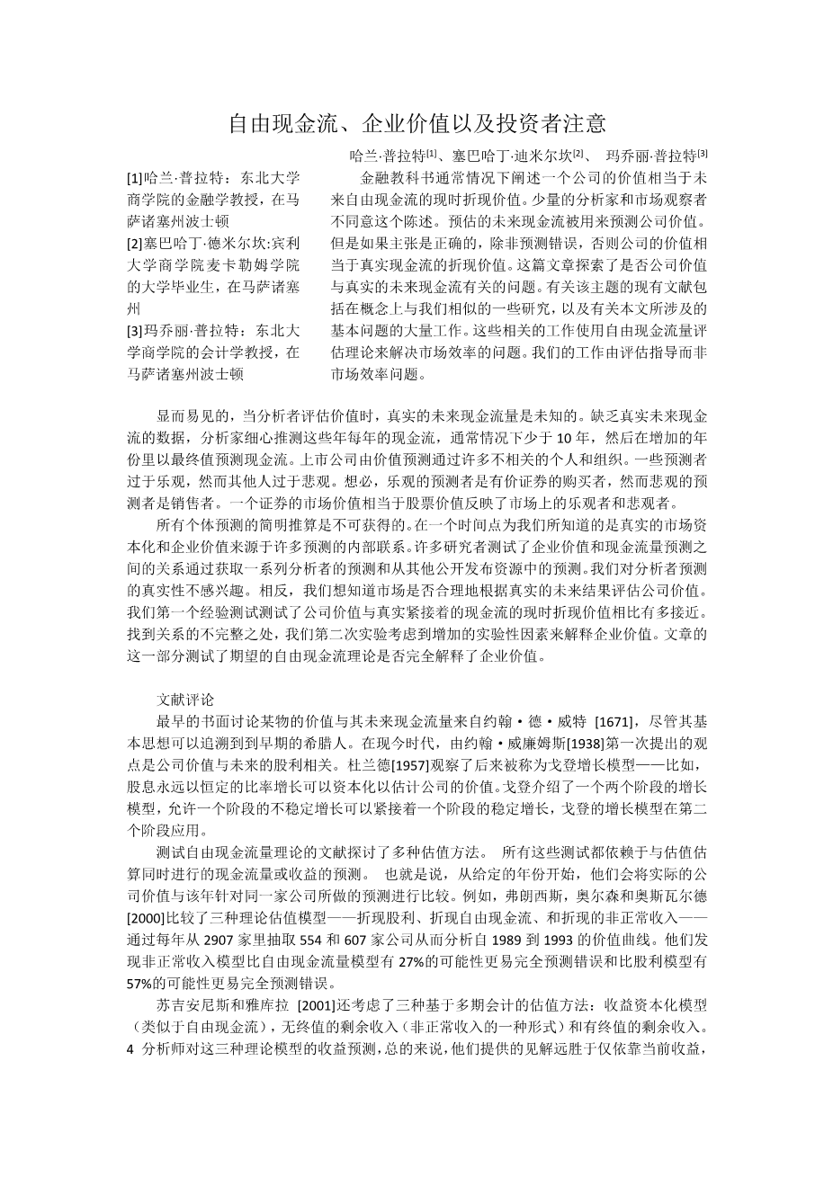 自由现金流、企业价值以及投资者注意外文翻译资料 2023-02-18 11:02 英语原文共 10 页,剩余内容已隐藏,支付完成后下载完整资料 英语译文共 8 页,剩余内容已隐藏,支付完成后下载完整资料 资料编号:[257755],资料为PDF文档或Word文档,PDF文档可免费转换为Word 您需要先支付 30元 才能查看全部内容!立即支付 发小红书推广免费获取该资料资格。点击链接进入获取推广文案即可: Ai一键组稿 | 降AI率 | 降重复率 | 论文一键排版 PREVIOUS NEXT 您可能感兴趣的文章 非财务信息流在风险管理中的意义外文翻译资料 上市公司偿付能力分析外文翻译资料 印度选定纺织企业的财务业绩分析外文翻译资料 关于公认会计准则的信任危机外文翻译资料 概念框架的组成部分外文翻译资料 回顾国家一般营业税:企业所得税,总收入税或增值税外文翻译资料 反向并购的真相外文翻译资料 财务报告内部控制管理报告能改善财务报告吗?外文翻译资料 自由现金流、企业价值以及投资者注意外文翻译资料 财务杠杆对股票收益方差的影响外文翻译资料