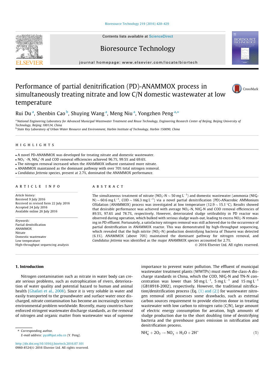 - 低温条件下采用短程反硝化-厌氧氨氧化(PD-ANAMMOX)工艺同步处理含有硝酸盐的废水和低C/N比生活污水的性能研究外文翻译资料