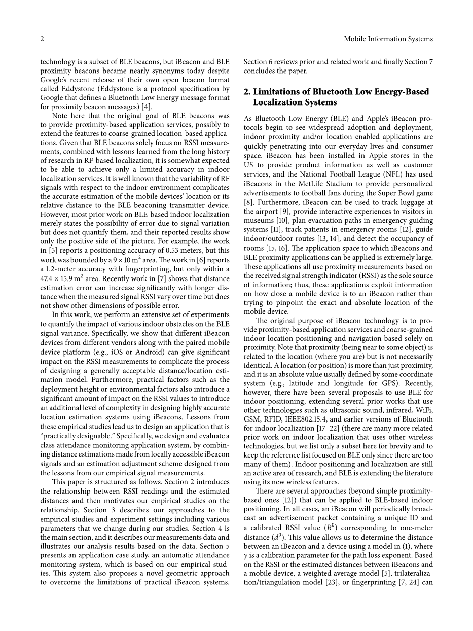 适用于国产化过程。估计还可以与行人方位推算(PDR)或滤波技术相结合,以改进跟踪或减少定位误差[6,25]。当然,所有这些方法都假设所有安装的iBeacons都拥有其预定义的位置信息,包括确切的坐标。