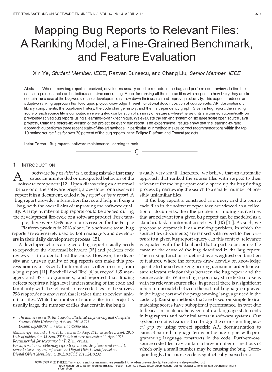 软件错误或缺陷是一种编码错误,可能导致软件组件的 意外或意外行为。 当发现软件项目的异常行为时,开发人员 或用户将在文档中报告它,称为bug报告或问题报告。bug报告提供了有助于修复bug的信息,其总体目标是提高软件质量。 在软件产品的开发生命周期中,可以打开大量的bug报告。 例如,仅在2013年就为Eclipse平台产品创建了3389个bug报告。 在软件团队中,bug报告被管理人员和开发人员广泛使用-在他们的日常开发过程中。被分配bug报告的开发人员通常需要复制异常行为并执行代码评审以找到原因。 然而,bug报告中经常缺少基本信息,bug报告的多样性和不均匀的质量使这个过程变得不简单。 Bacchelli和Bird调查了165名管理人员和873名程序员,并报告说,发现缺陷需要对代码有很高的了解,并熟悉相关的源代码文件。 在调查中,798名受访者回答说,审查不熟悉的文件需要时间。 虽然项目中源文件的数量通常很大,但包含错误的文件数量是通常很小。 因此,我们认为,根据源文件与bug报告的相关性对其进行排序的自动方法可以通过将搜索范围缩小到更少的可能不熟悉的文件来加快bug查找过程。如果错误报告被解释为查询,并且软件存储库中的源代码文件被视为文档集合,那么查找与给定错误报告相关的源文件的问题可以建模为信息检索(IR)[41]中的标准任务。 因此,我们建议将其作为一个排序问题来处理,其中源文件(文档)相对于它们与给定的bug报告(查询)的相关性进行排序)。 在这种情况下,相关性等同于特定源文件包含错误报告中描述的错误原因的可能性。 排序函数被定义为功能的加权组合,其中功能大量地利用软件工程领域特有的知识,以度量bug报告和源代码文件之间的相关关系。 虽然bug报告可能与其相关的源文件共享文本令牌,但通常,bug报告中使用的自然语言与代码[7]中使用的编程语言之间存在着明显的内在不匹配。 基于简单词汇匹配分数的排序方法具有次优性能,部分原因是bug报告中的自然语言语句与软件系统中的技术术语之间的词汇不匹配。 我们的系统包含通过使用项目特定的API文档将bug报告中的自然语言术语与代码中的编程语言结构连接起来,从而弥合相应的词汇差距的特性。 此外,源代码文件可能包含大量的方法,其中只有少量可能导致错误。 相应地,源代码在语法上被解析为方法,并且这些功能旨在利用方法级别的bug报告相关性度量。 以前已经观察到,软件过程度量(例如,更改历史)在检测缺陷[59]方面比代码度量(例如代码的大小)更重要。 因此,我们使用源代码的更改历史记录作为将容易发生故障的文件与bug报告链接的强信号。 另一个有用的特定于域的观察结果是,错误源文件可能导致多个异常行为,因此可能导致类似的错误报告。 如果我们将bug报告与用户和源代码文件等同于用户可能喜欢或不喜欢的项目,那么我们可以与推荐系统进行类比[46]并采用协作过滤的概念。 因此,如果以前固定的bug报告在文本上与当前的bug报告相似,那么与类似报告相关联的文件也可能与当前报告相关。 我们期望复杂的代码比简单的代码更容易出现错误。 相应地,我们设计了与查询无关的功能,通过从文件依赖关系图派生的代理属性来捕获代码复杂性,例如源文件的页面排名[54]分数或文件依赖的数量。