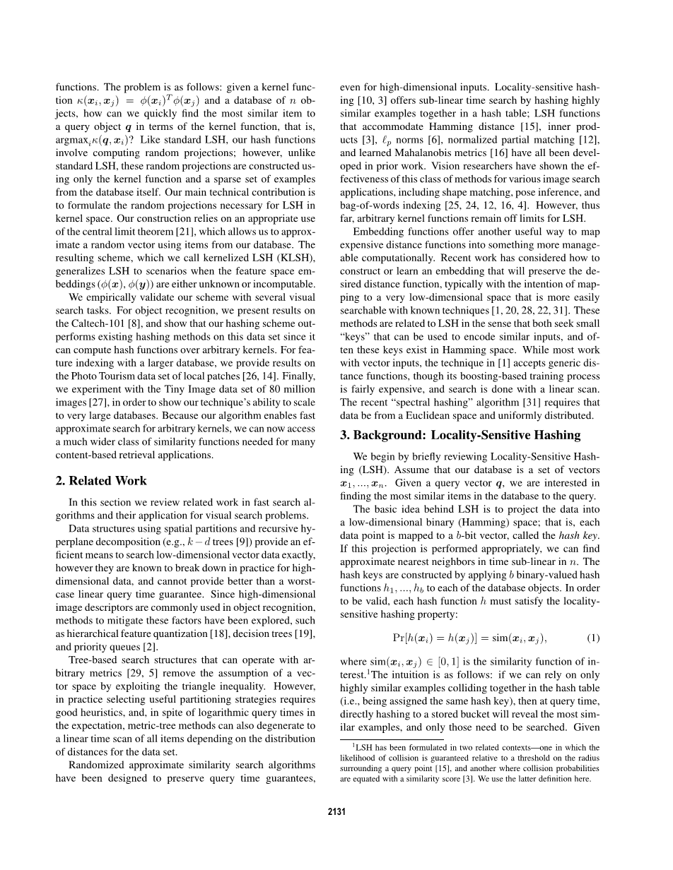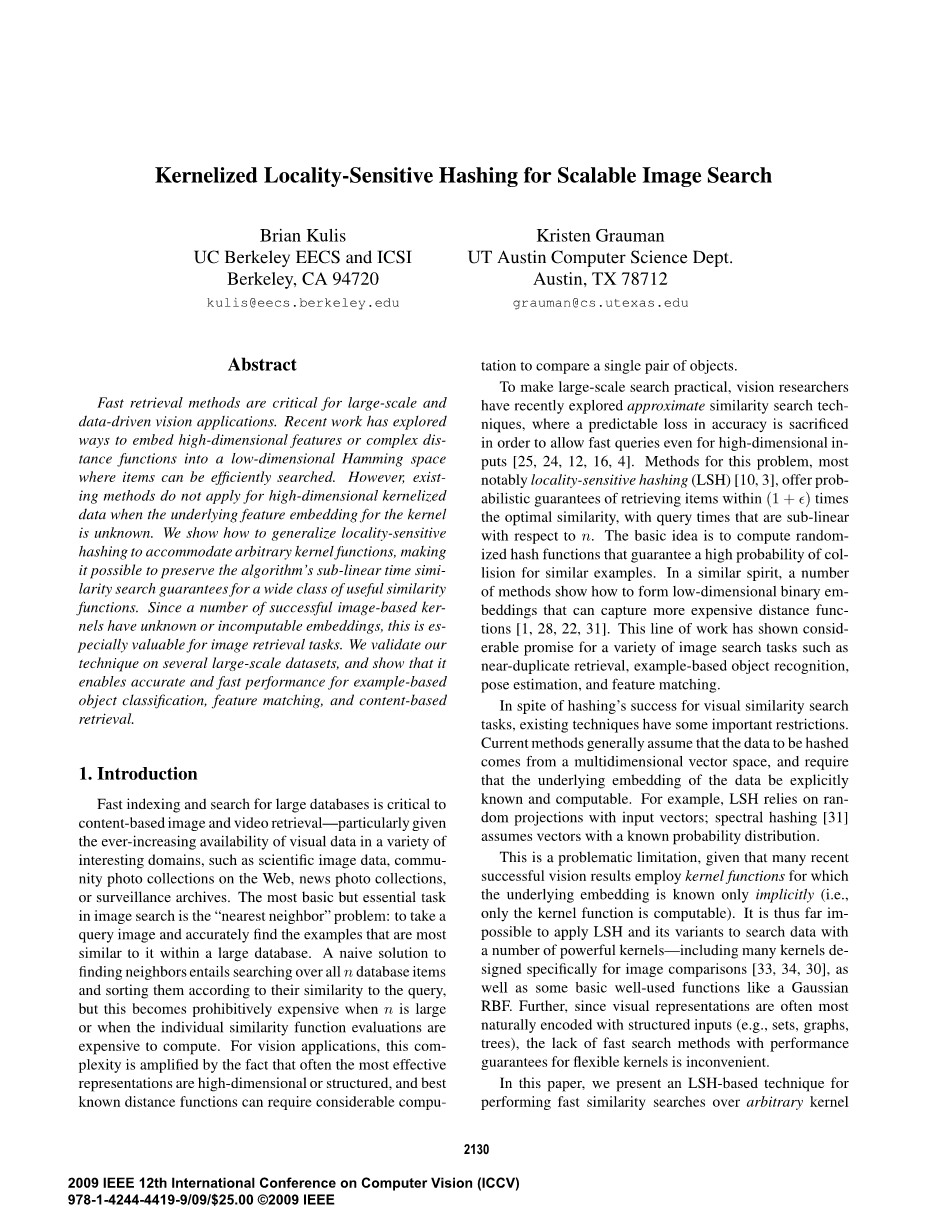 快速的检索方法对于大规模的和数据驱动的视觉应用很关键。最近的研究将高维特征或复杂距离函数嵌入低维汉明空间的方法可以有效搜索项目的地方。然而,现有的方法并不适用于高维的kernefied为内核嵌入底层特性时的数据是未知的。我们将展示如何泛化位置敏感的哈希以适应任意内核函数,使该算法在保证大量有用相似度的前提下,可以保留算法的子线性时间相似度搜索保证功能。由于许多成功的基于映像的内核具有未知的或不可计算的嵌入,这对于图像检索任务尤其有价值。我们验证在多个大规模数据集上进行了技术分析,并进行了验证实现准确和快速的性能,例如基于对象分类、特征匹配和基于内容检索。