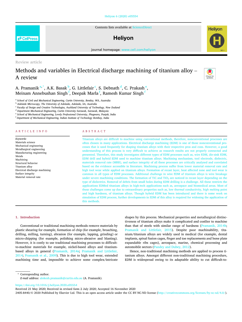 根据文献,到目前为止,钛合金的电离或蒸馏水仅用于电离电离(Antar等人,2010年;Nourbakhsh,2012年;Prohaszka等人,1997年;Yan和Lai,2007年)。这些介质流体也用于其他材料的线电火(Pramanik等人,2018年;Pramani等人,2015年;Pramanik和Littlefair,2016年),因为它的粘度低,冷却效果快,与碳氢油相比。此外,低成本和环境友好行为进一步有助于将去离子/蒸馏水用作加工各种材料的有前途的介质(Alias等人,2012年;Rao等人,2010年)。