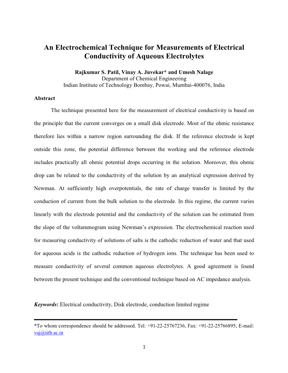 本文描述了一种新的电化学测量方法导电性。它使用铂旋转圆盘电极。技术原理如下。电流聚集在一个小的圆盘电极上。这导致了高电流密度在电极附近。由于电化学反应速率的增加随着过电位的指数变化,在足够高的过电位下,电荷速率转移受到从体积溶液到电极的电流传导的限制。由于电流收敛时,大部分欧姆电阻都位于周围狭窄的区域内磁盘。如果参比电极保持在这个区域之外,则两者之间的电位差工作电极和参比电极实际上包括发生在电极上的所有欧姆电势降解决方案。此外,该欧姆降与溶液的电导率可以通过an来联系由Newman1导出的解析表达式。这个表达式允许我们测量溶液的电导率。在导通限制范围内,电流随线性变化电极电位。因此,可以用线性扫描伏安法来检测这种状态。溶液的电导率可由该线性部分的斜率来估计voltammogram。电极的旋转有两个目的。首先,它阻碍注意力集中电极附近的极化。第二,通过快速扫过盘面,它可以防止由气体演化反应产生的过饱和气体电极,从而防止气泡的演化。在进化的情况下气泡是不可避免的,高盘速有利于气泡的快速分离(否则可能干扰电极反应)从电极表面。