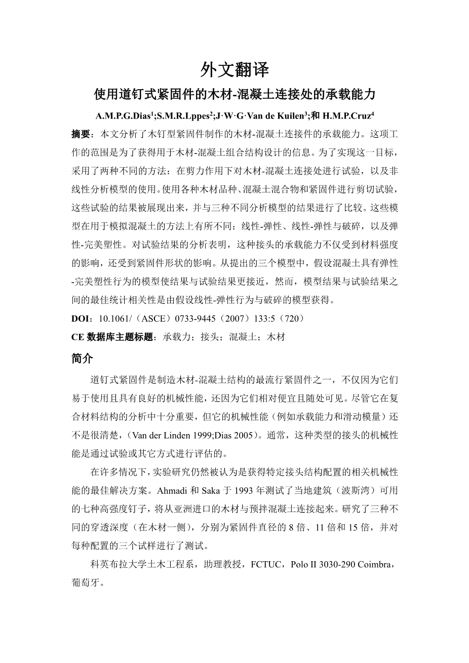 使用道钉式紧固件的木材-混凝土连接处的承载能力外文翻译资料 2023-04-13 11:04 英语原文共 8 页,剩余内容已隐藏,支付完成后下载完整资料 英语译文共 25 页,剩余内容已隐藏,支付完成后下载完整资料 资料编号:[589450],资料为PDF文档或Word文档,PDF文档可免费转换为Word 您需要先支付 30元 才能查看全部内容!立即支付 发小红书推广免费获取该资料资格。点击链接进入获取推广文案即可: Ai一键组稿 | 降AI率 | 降重复率 | 论文一键排版 PREVIOUS NEXT 您可能感兴趣的文章 循环荷载作用下基体延性对增强ECC柱构件性能的影响外文翻译资料 第二章 多层建筑外文翻译资料 9.4 销连接构件外文翻译资料 公共建筑方案设计决策中的生命周期成本优化外文翻译资料 全球项目成本管理专业标准外文翻译资料 开发基于BIM的web工具作为可持续建筑行业的材料和组件库外文翻译资料 尼日利亚建筑项目的不道德的专业行为和糟糕的工艺表现:后果和前进的道路外文翻译资料 学生对高等教育部门BIM教育的看法:英国和美国的观点外文翻译资料 桥墩对冰层起裂影响的试验研究外文翻译资料 成本控制系统开发:中小型承包商的协作方法外文翻译资料