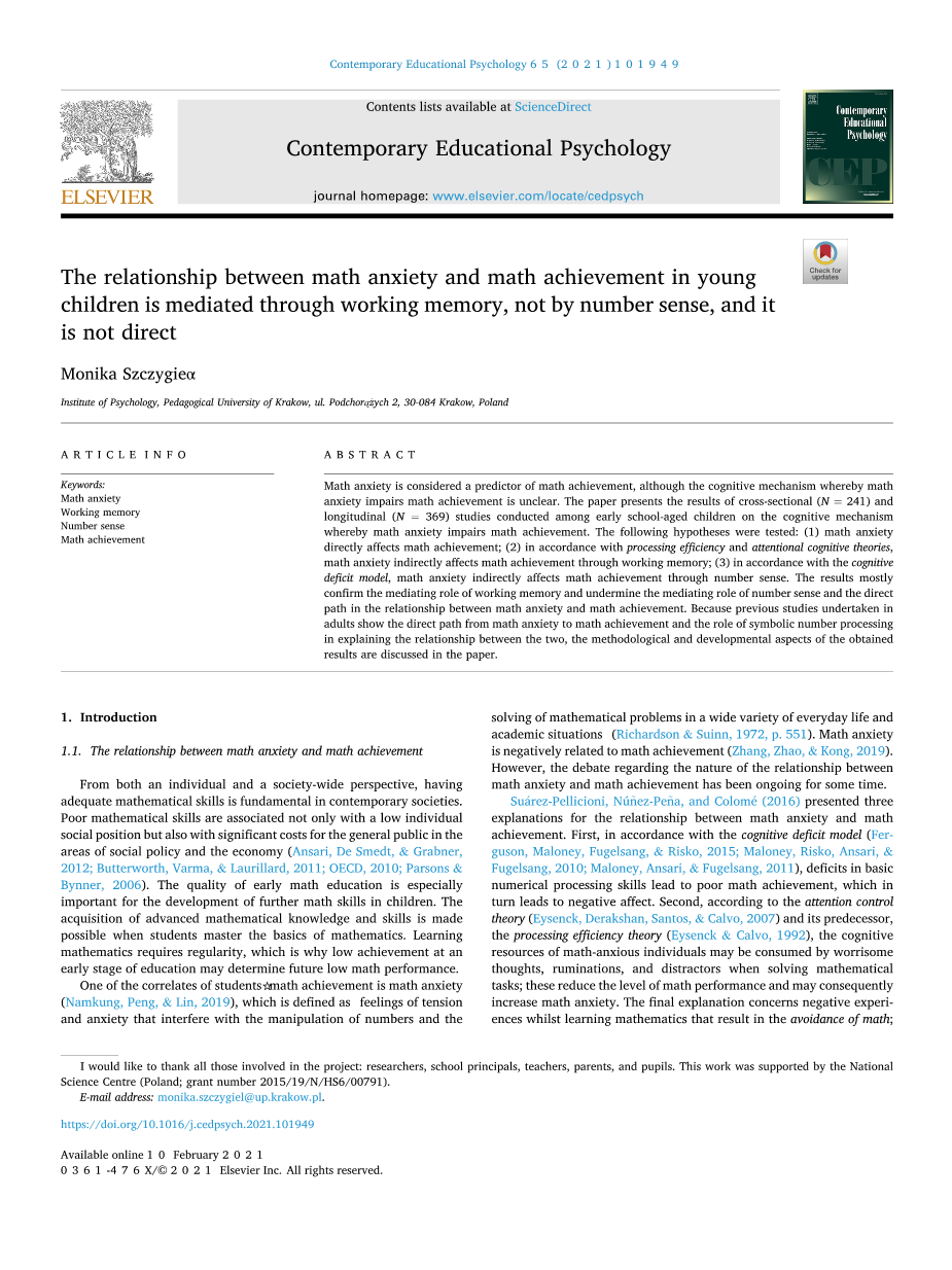 本论文的主要目的是验证工作记忆在数学焦虑和数学成绩之间起中介作用的模型的普遍性,近似数系统在数学焦虑和数学成绩之间的中介作用,以及从数学焦虑到数学成绩的直接途径(Skagerlund等人,2019;Sursquo;arez Pellicini等人,2016)。虽然一些针对成年人(Skagerlund等人,2019)、学龄儿童(Soltanlou等人,2019)和幼儿(Justicia Galiano等人,2017)的研究证实了第一个假设,但由于成人(Douglasamp;LeFevre,2017;Skagerlund等人,2019)以及儿童数据的缺失,数字感的中介作用肯定更具争议。根据之前的研究,可以假设数学焦虑会增加工作记忆资源,从而影响儿童的数学成绩。基于之前的研究,人们可能认为数学焦虑会加重工作记忆资源的负担,从而影响儿童的数学成绩。此外,有人假设,数学焦虑会削弱更多的基本数字处理能力,进而降低儿童的数学成绩。在成年人中观察到了从数学焦虑到数学成绩的直接途径,这可能是多年来回避数学活动的结果。如果是这样,那么数学焦虑对幼儿数学成绩的直接影响就不存在或者很弱。然而,由于不知道儿童需要多长时间才能形成数学回避策略,因此有必要在小学生中测试这一路径。
