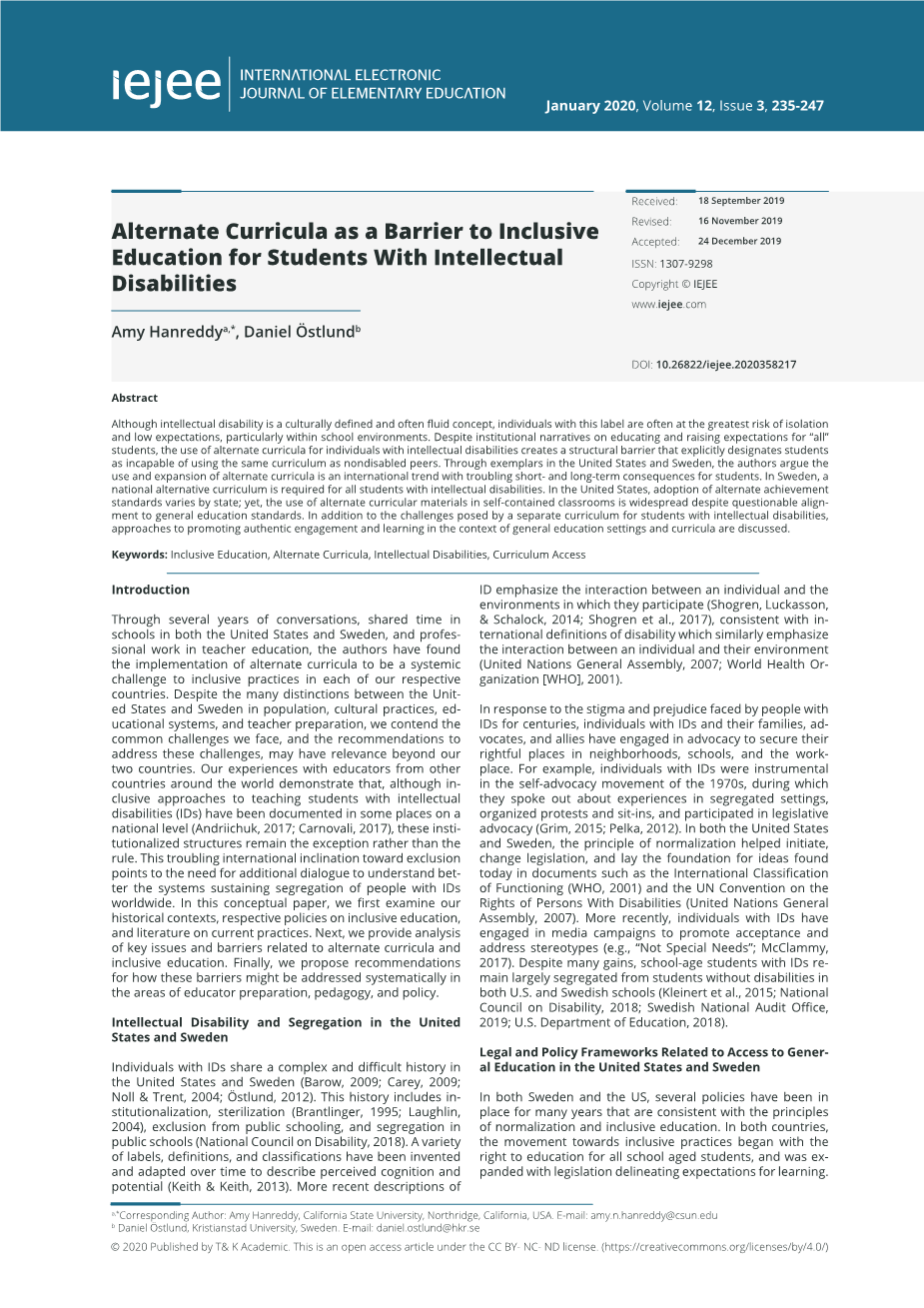 摘要:尽管智力障碍是一个根据文化定义、经常变化的概念,但带有这种标签的人往往处于被孤立和低期望的最大风险中,尤其是在学校环境中。尽管学校对教育和提高“所有”学生的期望做出了规定,但为智障人士使用替代性课程仍会造成结构性障碍,明确指出学生无法使用与非残疾同龄人相同的课程。通过美国和瑞典的范例,作者认为替代性课程的使用和扩展是一种国际趋势,会给学生带来令人不安的长短期后果。在瑞典,所有智障学生都需要一门全国性的替代性课程。在美国,不同的州采用不同的成就标准;然而,尽管与普通教育标准的一致性存在疑问,但在独立的教室中使用替代性课程材料的情况很普遍。除了为智障学生开设单独的课程所带来的挑战外,本文还讨论了在普通教育环境和课程的背景下促进真正参与和学习的方法。