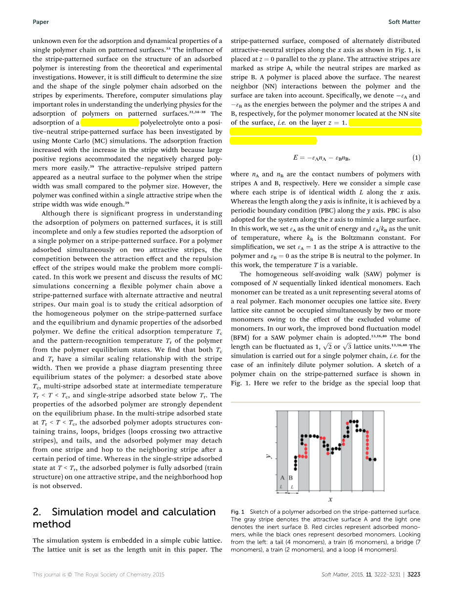 仿真系统嵌入在一个简单的立方晶格中。本文将各单体设为长度单位。在条纹表面,由沿x轴交替分布的中性条纹组成,如图1所示,放置在z=0处,与XY平面平行。有吸引力的条纹标记为条纹A,而中性条纹标记为条纹B,高分子链放置在表面上方。考虑了高分子链与表面的最近邻(NN)相互作用。得到: