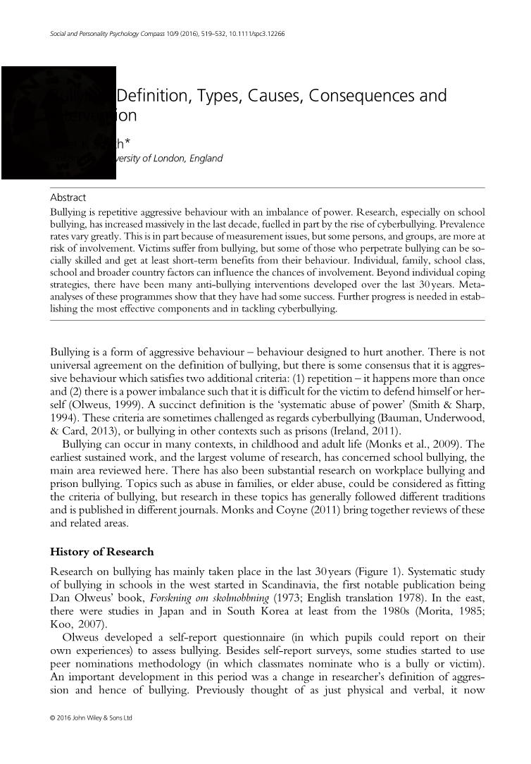 摘要:欺凌是一种权力失衡的重复性攻击行为。在过去的十年里,有关欺凌的研究,特别是关于校园欺凌的研究大量增加,部分原因是网络欺凌的增加。欺凌发生率差别很大。这在一定程度上是因为测量问题,但是一些个人和团体更容易卷入其中。受害者遭受欺凌,但是有些欺凌者非常有技巧,至少可以从他们的行为中得到短期的好处。个人因素、家庭因素、学校因素、学校因素和更广泛的国家因素都会影响参与的机会。除了个人应对策略之外,在过去的30年里已经发展了许多反欺凌干预措施。对这些方案的元分析表明,它们取得了一些成功。在确定最有效的组成部分和处理网络欺凌方面需要取得进一步进展。